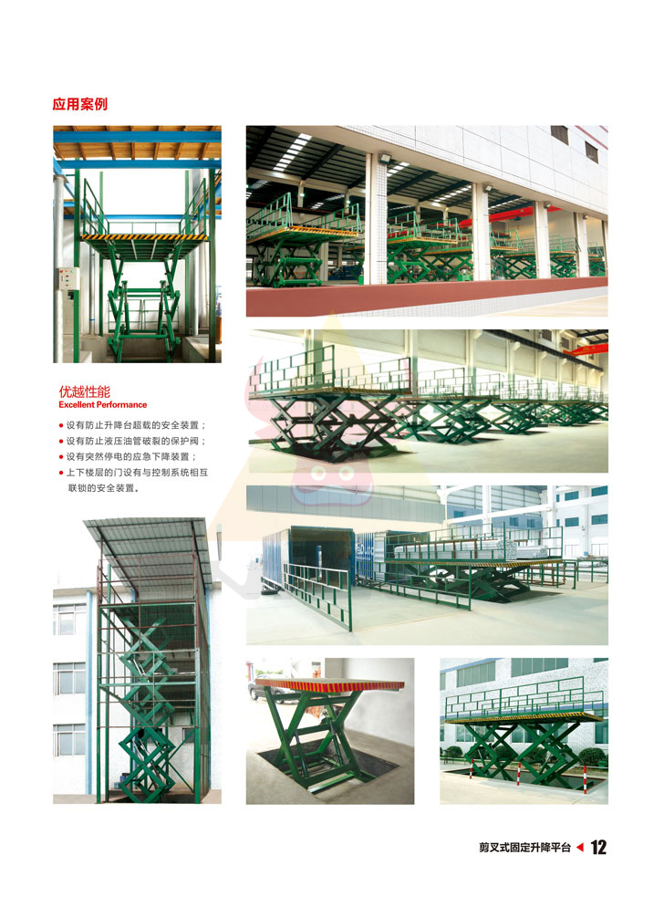 固定式單剪叉液壓升降平臺多用于生產流水線高度差之間貨物運送,物料上下線,工件裝配時調節工作高度,高處給裝機送料,大型設備裝配時部件舉升,倉儲裝卸場所與叉車等搬運車輛配套進行貨物快速裝卸等。