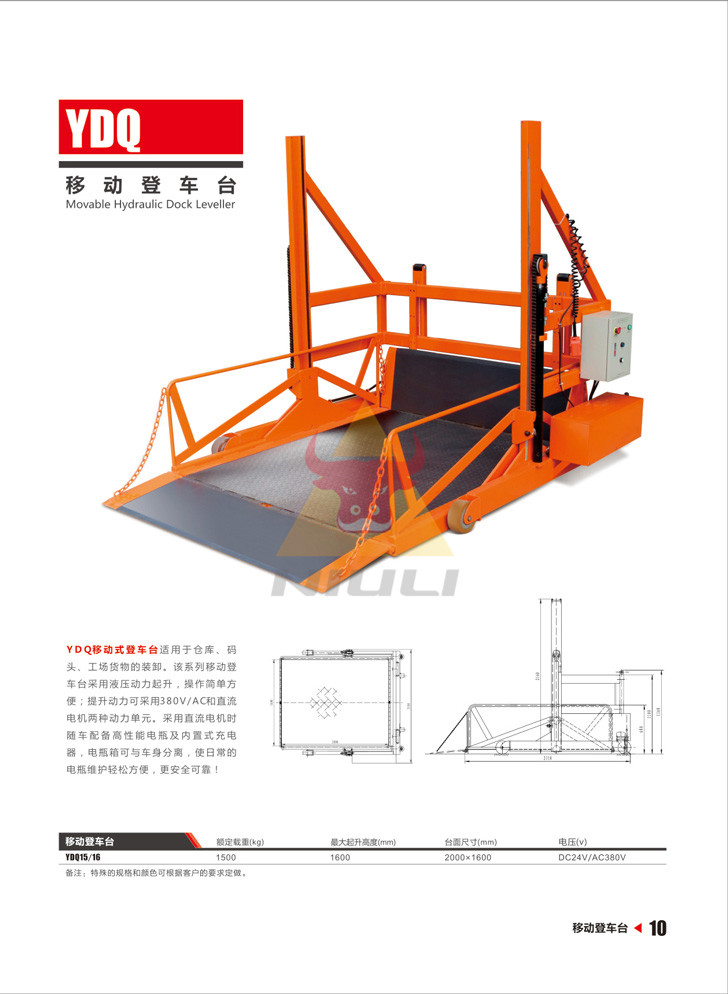 YDQ移動式登車臺適用于倉庫、碼頭、工場貨物的裝卸。該系列移動登車臺采用液壓動力起升,操作簡單方便;提升動力可采用380V/AC和直流電機兩種動力單元。采用直流電機時隨車配備高性能電瓶及內置式充電器。