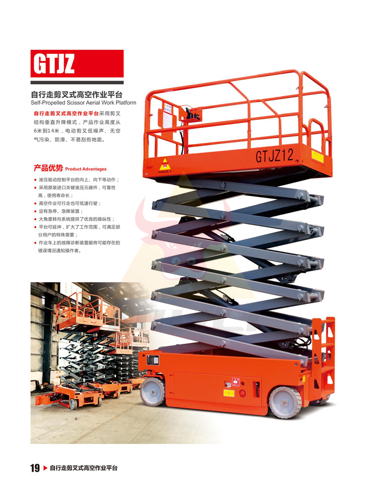 自行走剪叉高空作業平臺采用剪叉結構垂直升降模式,產品作業高度從6米到14米,電動剪叉低噪聲、無空氣污染、防滑、不易刮傷地面。