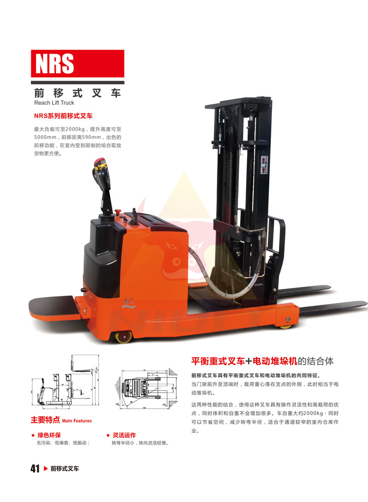 NRS系列前移式叉車(chē)是工業(yè)搬運(yùn)車(chē)輛,倉(cāng)儲(chǔ)叉車(chē)的一種,是指對(duì)成件托盤(pán)貨物進(jìn)行裝卸、堆垛和短距離運(yùn)輸作業(yè)的前移輪式搬運(yùn)車(chē)輛。用于倉(cāng)儲(chǔ)大型物件的運(yùn)輸,電池驅(qū)動(dòng),液壓工作站提升。