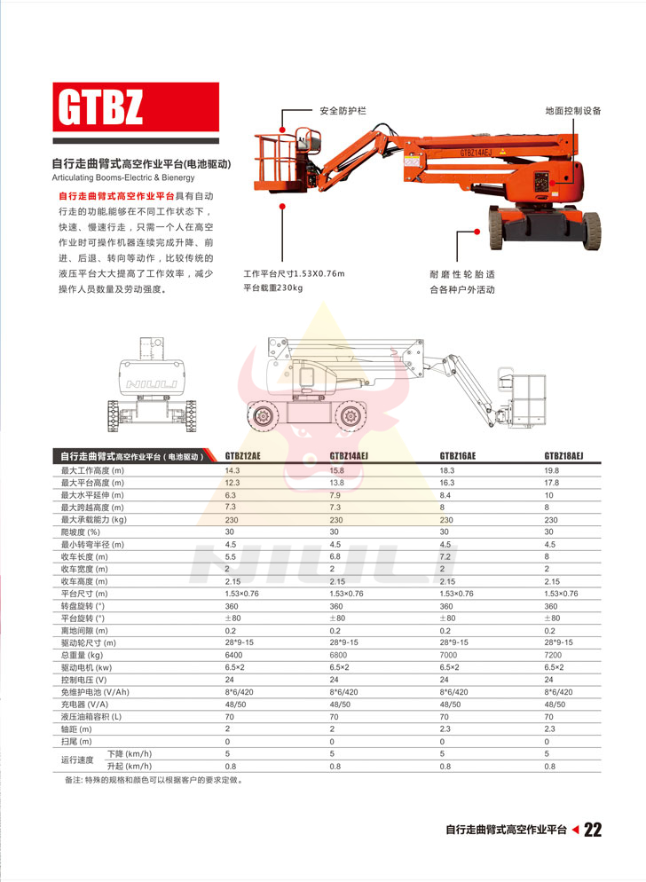 曲臂式高空作業平臺具有伸縮臂,能懸伸作業,跨越一定的障礙或在一處升降可進行多點作業;升降平臺移動性好,轉移場地方便;外觀美觀,適于室內外作業和存放。