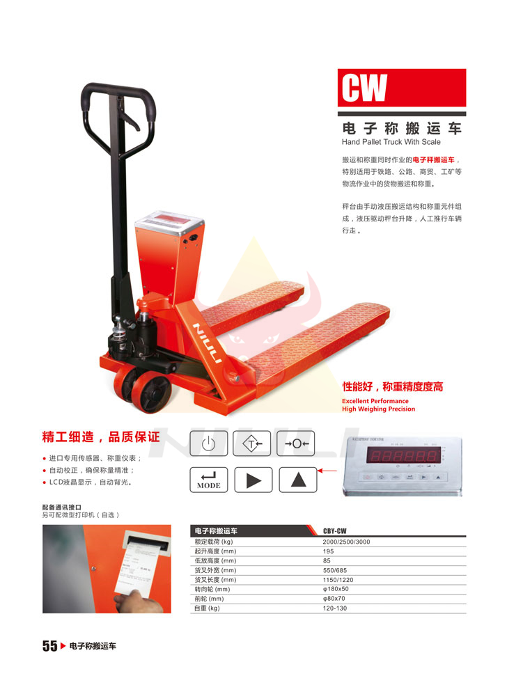 搬運(yùn)和稱重同時(shí)作業(yè)的電子秤搬運(yùn)車,特別適用于鐵路、公路、商貿(mào)、工礦作業(yè)中的貨物搬運(yùn)和稱重。秤臺(tái)由手動(dòng)液壓搬運(yùn)結(jié)構(gòu)和稱重原件組成,液壓驅(qū)動(dòng)秤臺(tái)升降,人工推行車輛行走。