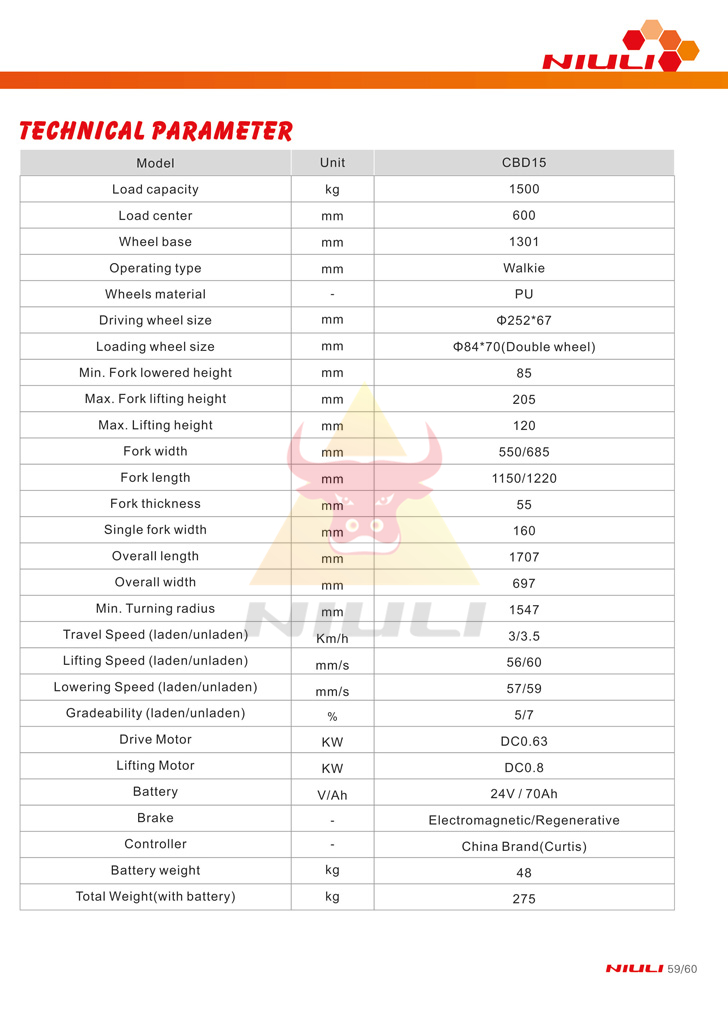 Model Load capacity(kg) Max.Lifting height(mm) Fork length(mm) Min.Lifting height(mm) Truck weight(kg)