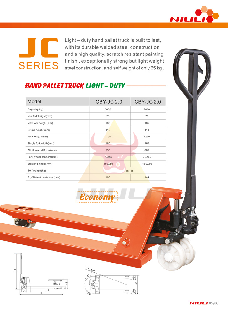 Light – duty hand pallet truck is built to last, with its durable welded steel construction and a high quality, scratch resistant painting finish , Exceptionally strong but light weight steel construction, and self weight of only 65 kg .